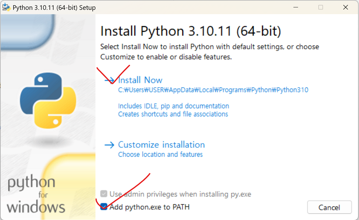 - PATH는 파이썬의 환경변수를 지정해주는 것입니다. 클릭을 안하시면 나중에 따로 처리해주어야 합니다.