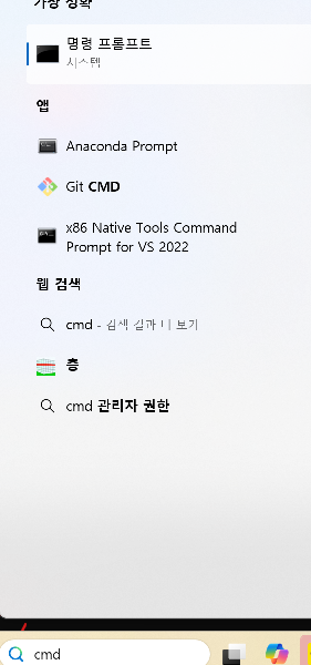 1) 바탕화면 아래쪽에 검색이 있을겁니다. 검색을 누르고 cmd를 쳐서 실행시켜 주세요.