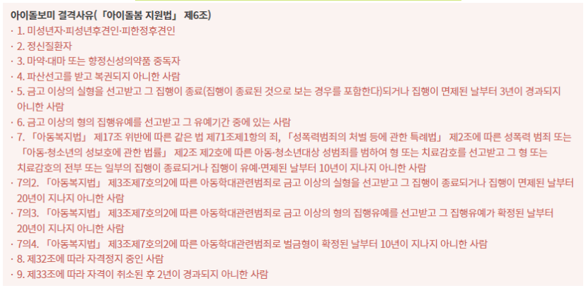 아이돌봄 지원법에서 규정한 결격사유만 없으시면, 모든 활동 지원자가 아이돌보미 지원 신청이 가능합니다.