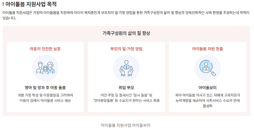 부모의 맞벌이가 많아지면서 양육의 공백이 발생한 가정에게 아동돌보미가 직접 찾아가 돌봄 서비스를 제공하는 것입니다. 만12세 이하의 아동을 대상으로 하고, 양육부담의 경감, 저출산 해소를 위해 만들어졌습니다.