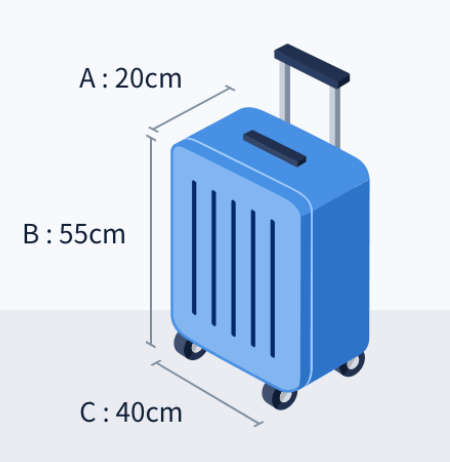 가방 하나의 규격은 세 변의 합이 115cm(45in) 이내 또는 각 변이 각각 세로 20cm, 높이 55cm, 가로 40cm를 초과해서는 안됩니다.